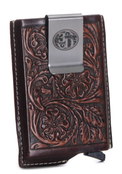3D Men's Brown Tooled Leather with Aluminum Alloy Body and Money Clip Card Holder