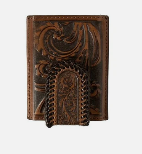 Decorative and stylish mens utility wallet. It is made of genuine leather and has an embossed scrolling pattern on the front and tab. Trimmed with braided chocolate edge lacing. Magnetic money clip on the front and a plastic push lever on the back.v