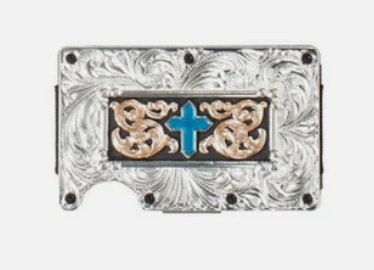 A great way to keep your credit cards safe with this 3D utility wallet by M&F Western Products. RFID blocking function for card protection. Holds up to 10 cards. Turquoise cross in the center on a matte black background and gold scroll accents. Shiny silver finish with laser engraved scrolling pattern on the front and a black carbon back.