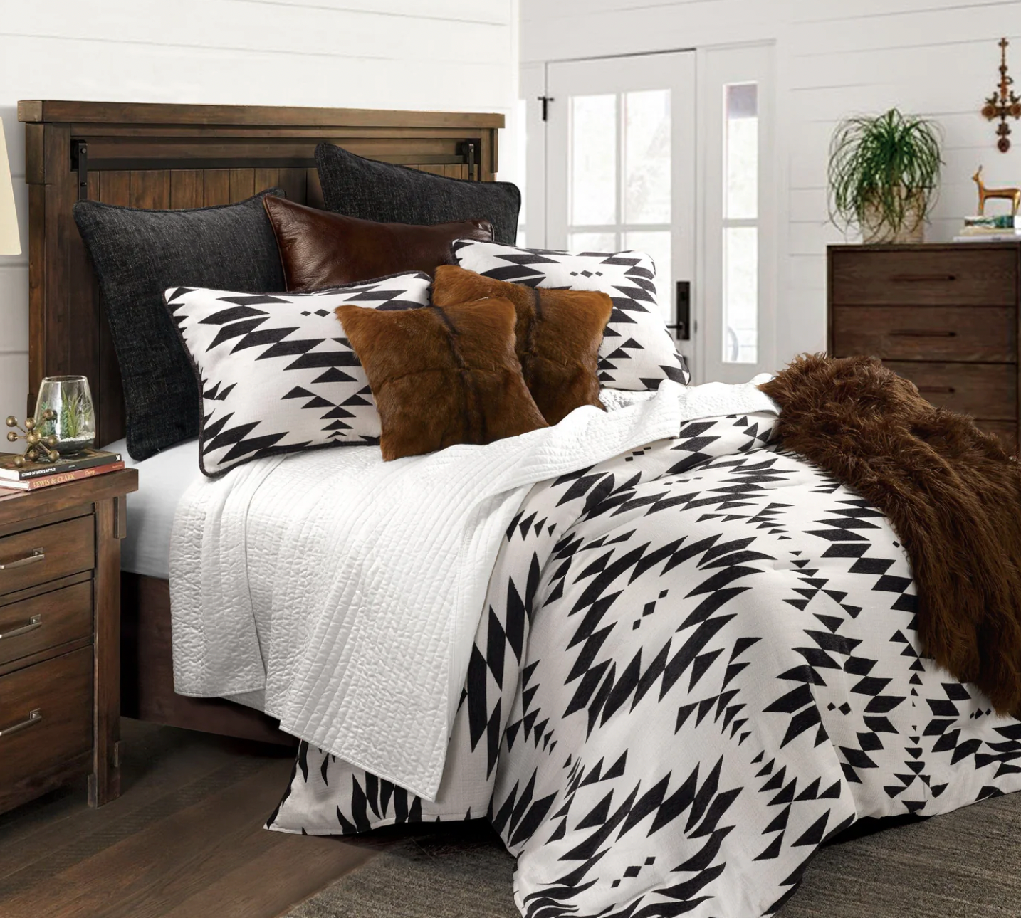 Modern monochrome combines with Aztec-inspired motifs in our Amelia Aztec Comforter Set, creating a sophisticated and balanced bedding ensemble. The symmetrical pattern draws your eyes and produces a visually stunning centerpiece for any rustic bedroom. Complete the look with Amelia's coordinating shams and pillows. Or layer with our Stonewashed Cotton Velvet Quilt or faux fur throws and pillows for a stylish finish.