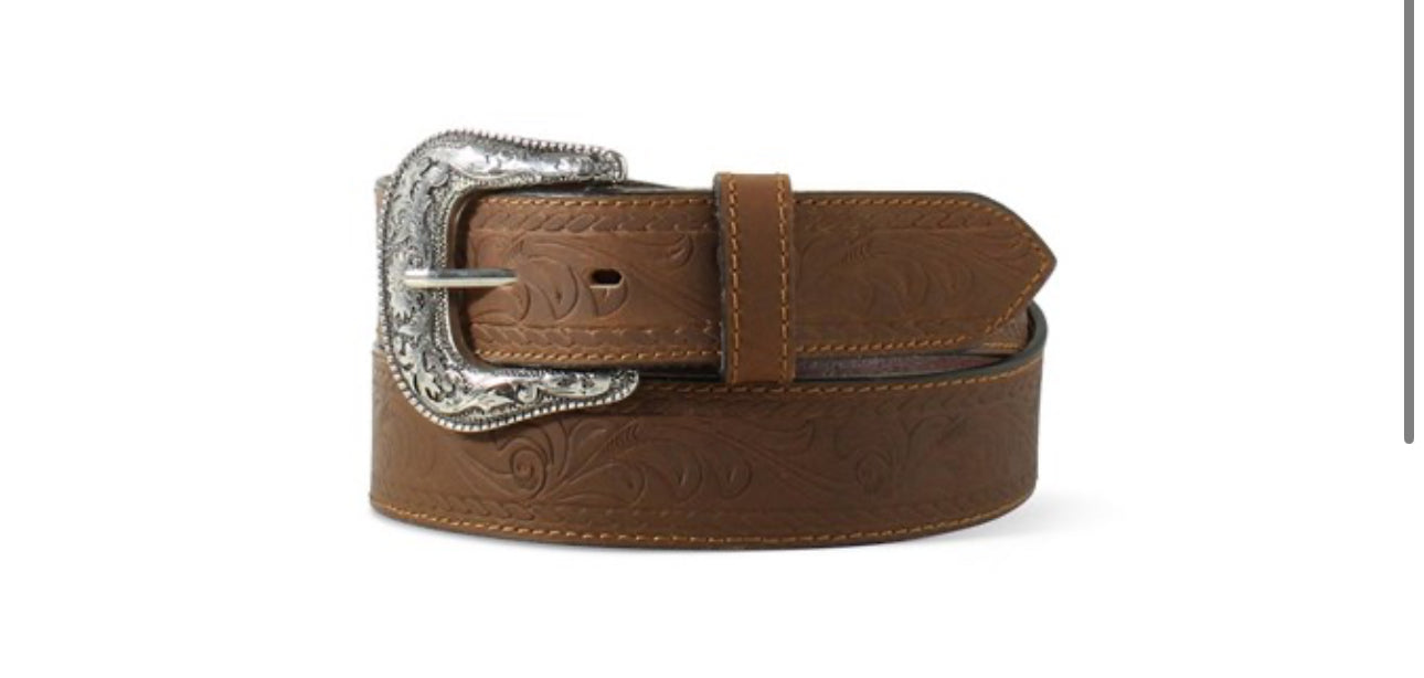 Make a statement with this men’s belt from Ariat by M&F Western. This medium brown belt has floral embossing and self stitched edges. It has an antique silver buckle. 1 ½” wide. Ariat Style Number A1041044.