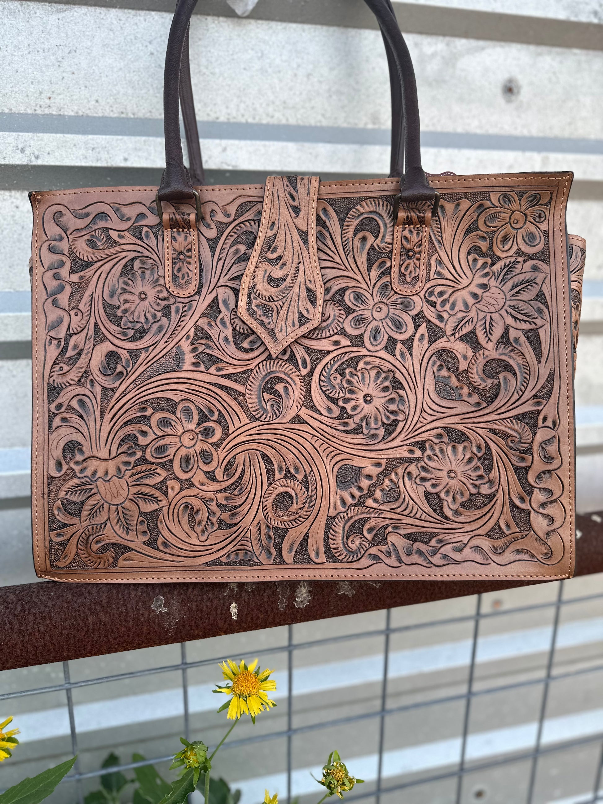 This exquisite tooled leather tote bag combines artistry and functionality, featuring intricate designs that showcase skilled craftsmanship. Made from high-quality leather, it offers durability and a timeless aesthetic, making it suitable for both casual and formal occasions. The spacious interior provides ample room for essentials, while sturdy handles ensure comfortable carrying.