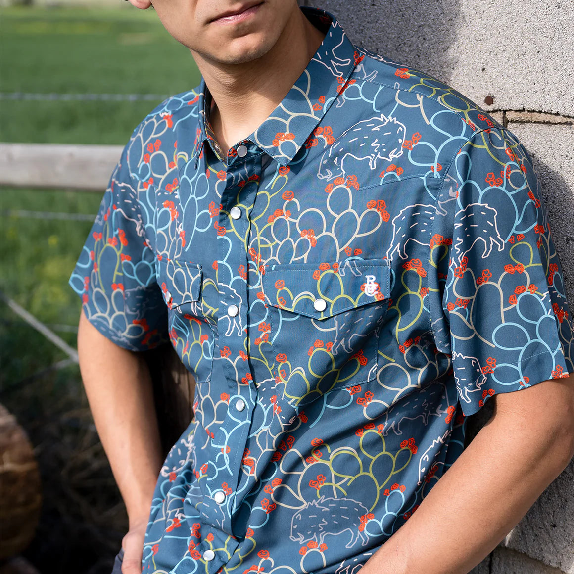 Our Javelina Paradise pearl snap western shirt features a javelina and prickly pear pattern, pearl snap button down, and embroidered RBC iron brand logo on the front pocket.