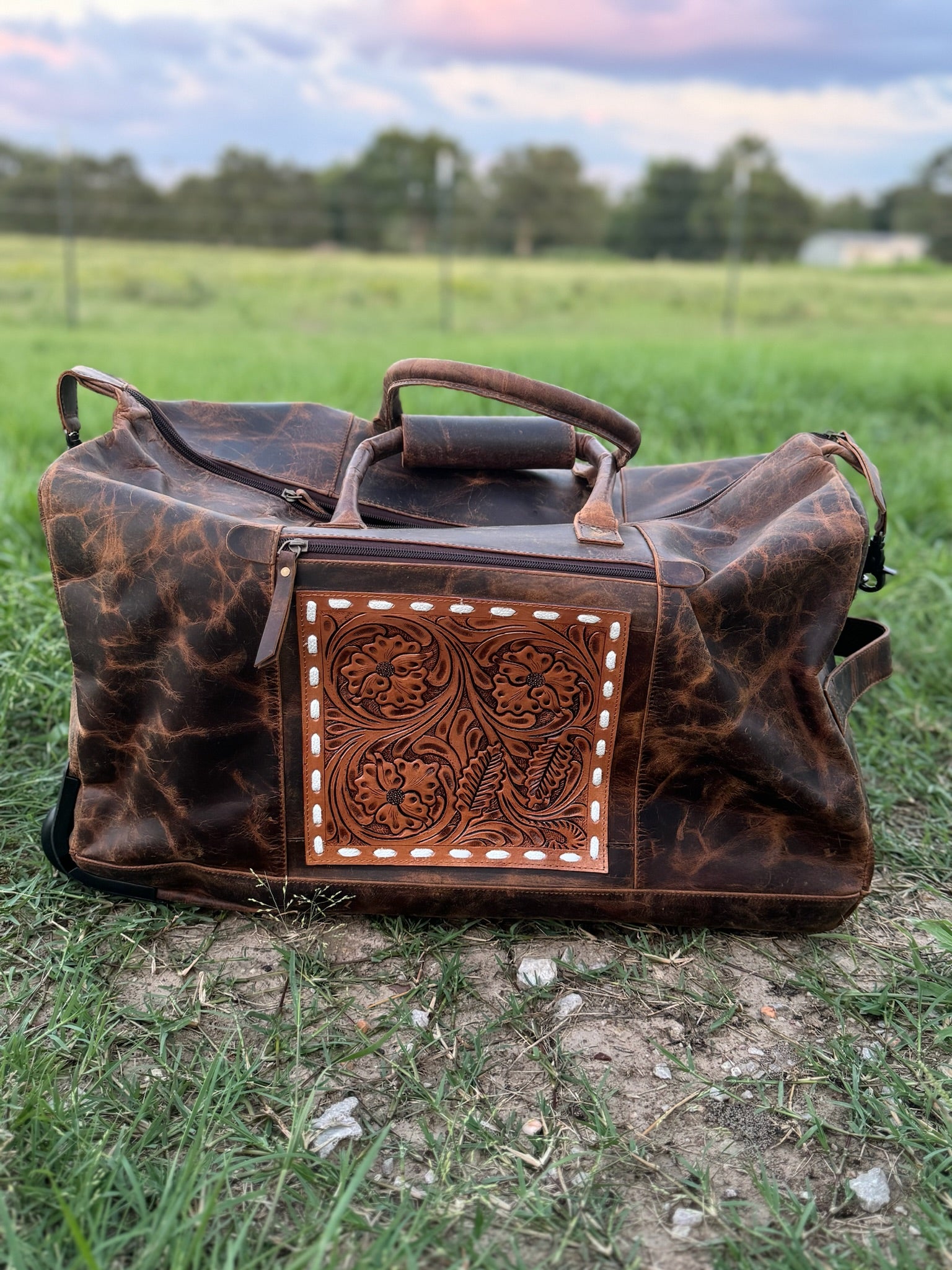 This Duffel is a suitcase style rolling duffel bag, with a gorgeous tooled leather patch on front.
