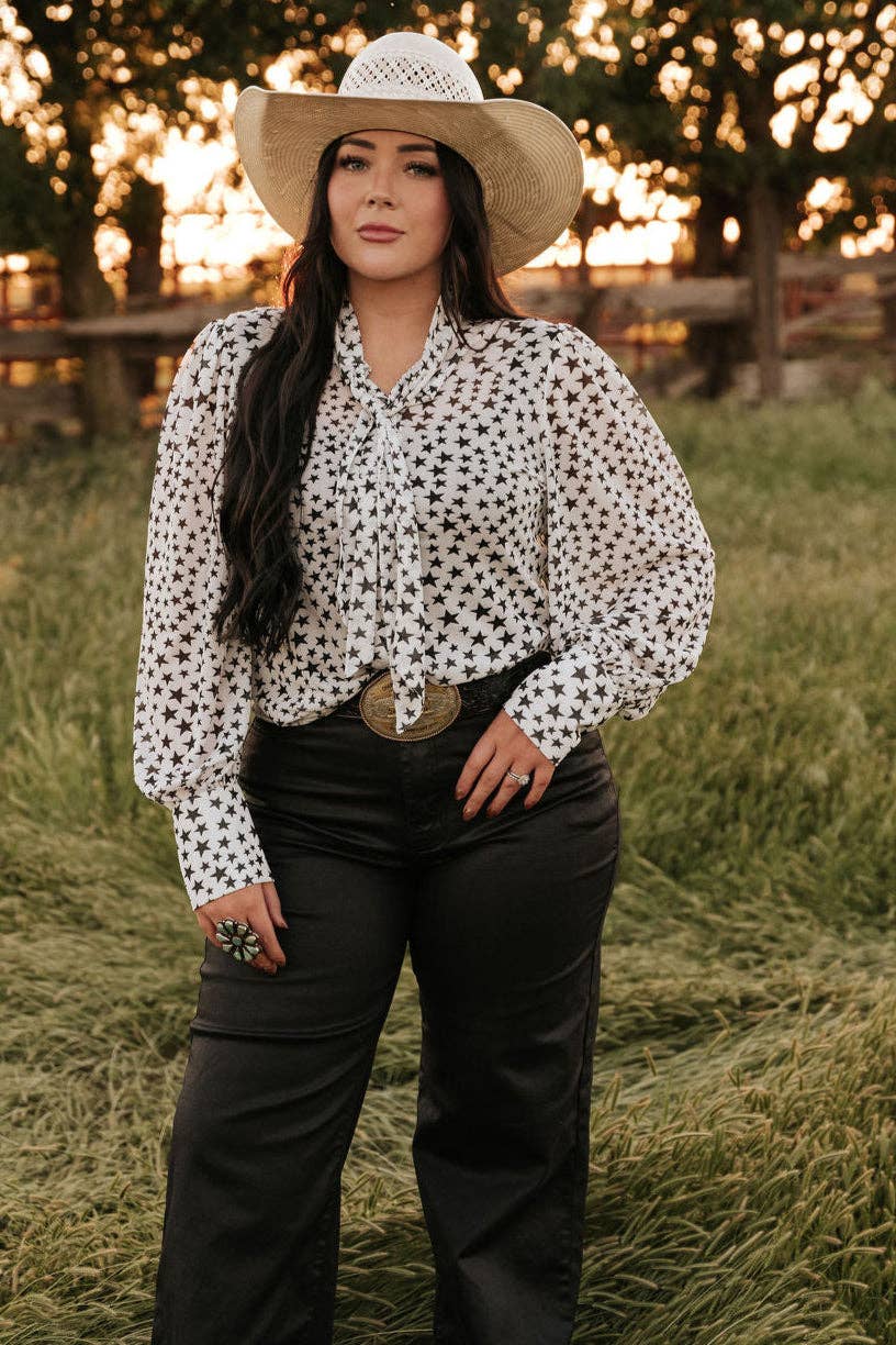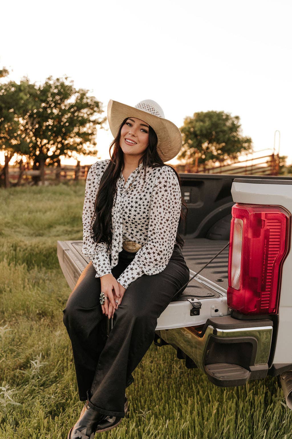 Complements Western-inspired accessories — belts, hats, or jackets — for a modern cowgirl vibe