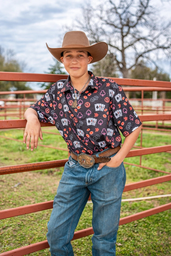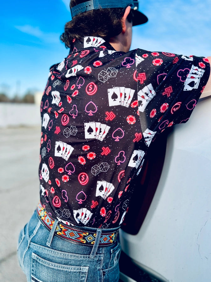 Take on the excitement with The Gambler. Our Gambler Dri-fit polo keeps you cool and comfortable while you hit the tables, prepare to swing a rope or take a hit at a golf ball. With its sleek design and moisture-wicking fabric, you'll be ready to take on the night in style. Classic men’s fit **Model is wearing large**