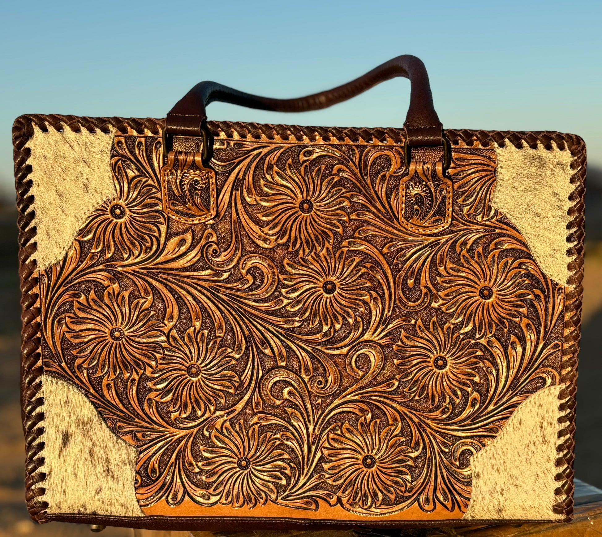 This exquisite tooled leather tote bag combines artistry and functionality, featuring intricate designs that showcase skilled craftsmanship. Made from high-quality leather, it offers durability and a timeless aesthetic, making it suitable for both casual and formal occasions. The spacious interior provides ample room for essentials, while sturdy handles ensure comfortable carrying.