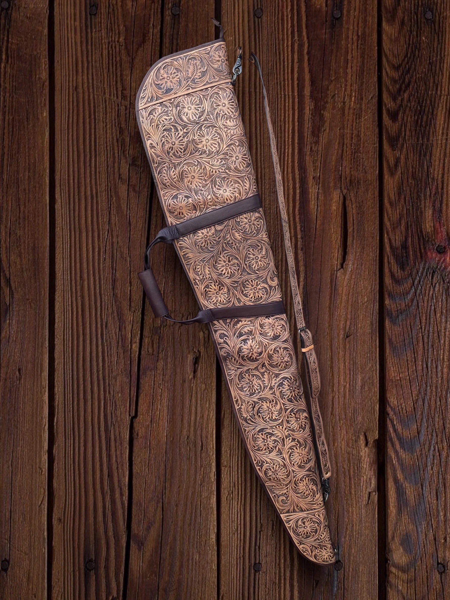 This genuine leather tooled carry case is expertly designed for transporting rifles securely and stylishly. Crafted from high-quality leather, it features intricate tooling that adds a touch of elegance while ensuring durability. The case is spacious enough to accommodate various rifle sizes, providing ample protection with its padded interior. Ideal for outdoor enthusiasts and hunters, this case combines functionality with a classic aesthetic, making it a perfect accessory for any firearm owner.